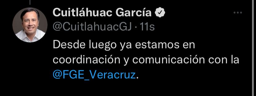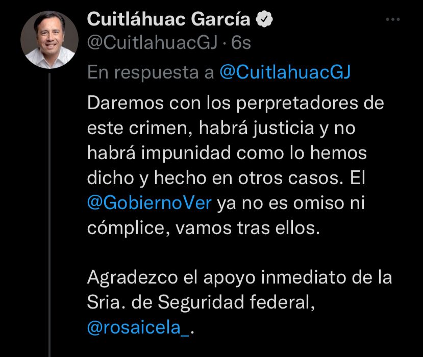 Así mismo, el mandatario veracruzano aseguró que “se dará con los perpretadores de este crimen, habrá justicia y no habrá impunidad como lo hemos dicho y hecho en otros casos” y mencionó que el gobierno de Veracruz ya no es omiso ni cómplice de estos actos.