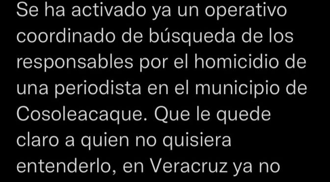 Xalapa, Ver. – Ante el ataque registrado a periodistas del sur de Veracruz, el gobernador del Estado a través de sus redes sociales informó que “se ha activado ya un operativo coordinado de búsqueda de los responsables por el homicidio de una periodista en el municipio de Cosoleacaque”.