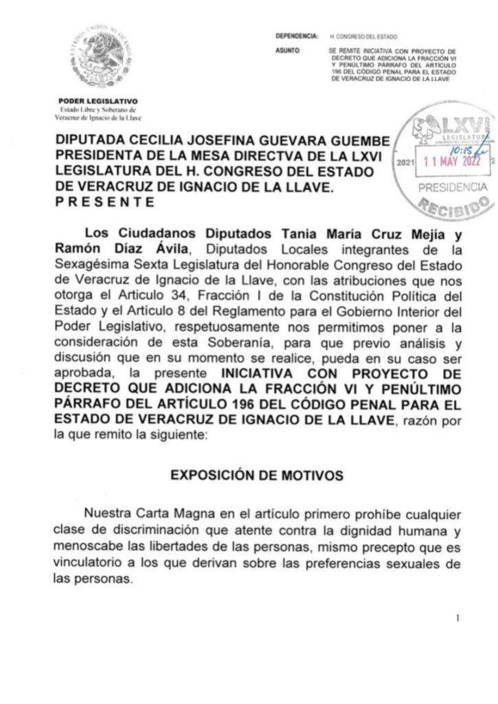 En la exposición de motivos también se incluye que “aunque no hay cifras oficiales sobre el número de personas que están sometidas a las terapias de conversión o ECOSIG (Esfuerzos por Corregir la Orientación Sexual e Identidad de Género), en Veracruz siguen vigentes, y la evidencia indica que todas las personas que las han padecido sufren graves secuelas físicas y emocionales en su persona, además de sentimientos de culpa, vergüenza, depresión, falta de autoestima y pensamientos suicidas”.