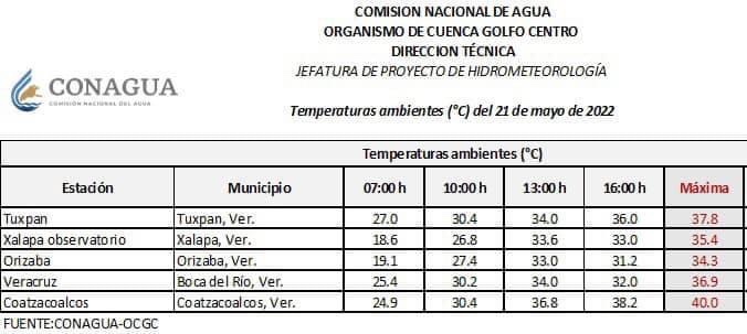 En Tuxpan se ha registrado una temperatura máxima de 37.8 grados. Mientras que en Orizaba 34.3; Veracruz, Boca del Río con 36.9 y Coatzacoalcos con 40 grados Celsius.