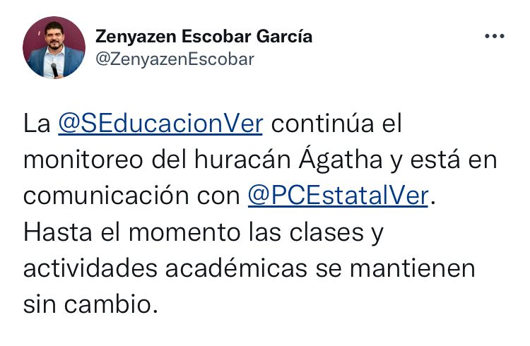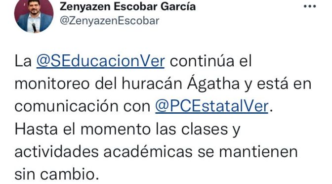 “Continúa el monitoreo del huracán Ágatha y está en comunicación con @PCEstatalVer. Hasta el momento las clases y actividades académicas se mantienen sin cambio”, se lee en sus redes sociales.