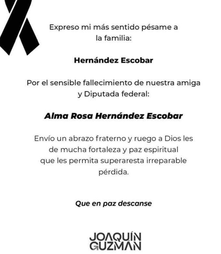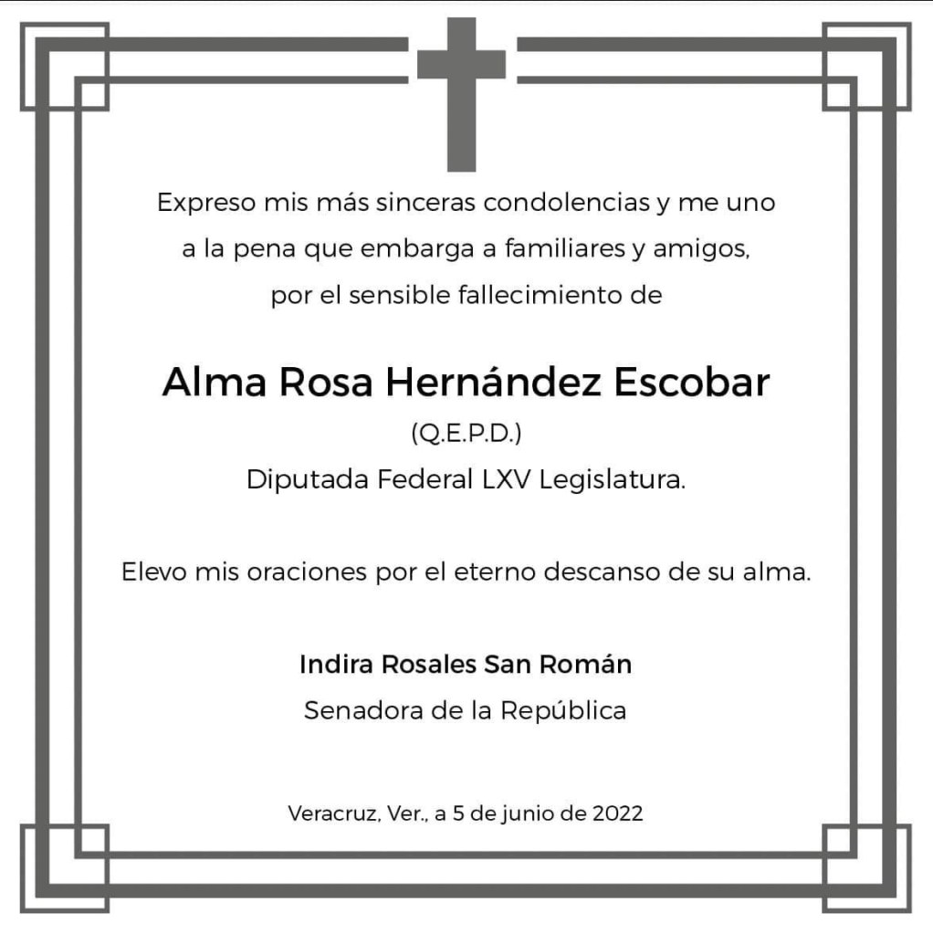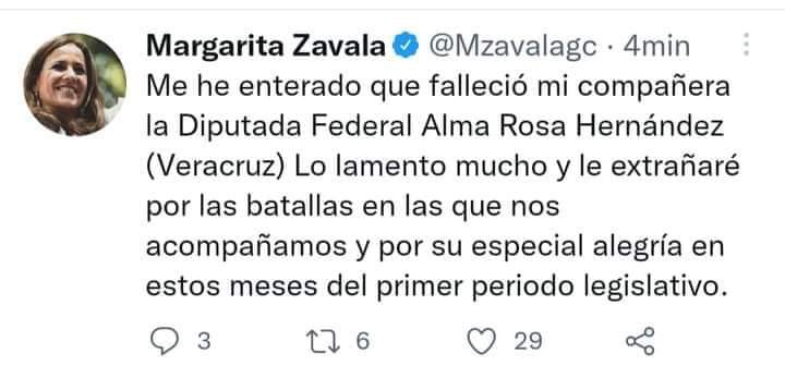 “Me he enterado que falleció mi compañera la Diputada Federal Alma Rosa Hernández (Veracruz) Lo lamento mucho y le extrañaré por las batallas en las que nos acompañamos y por su especial alegría en estos meses del primer periodo legislativo”, escribió Margarita Zavala.