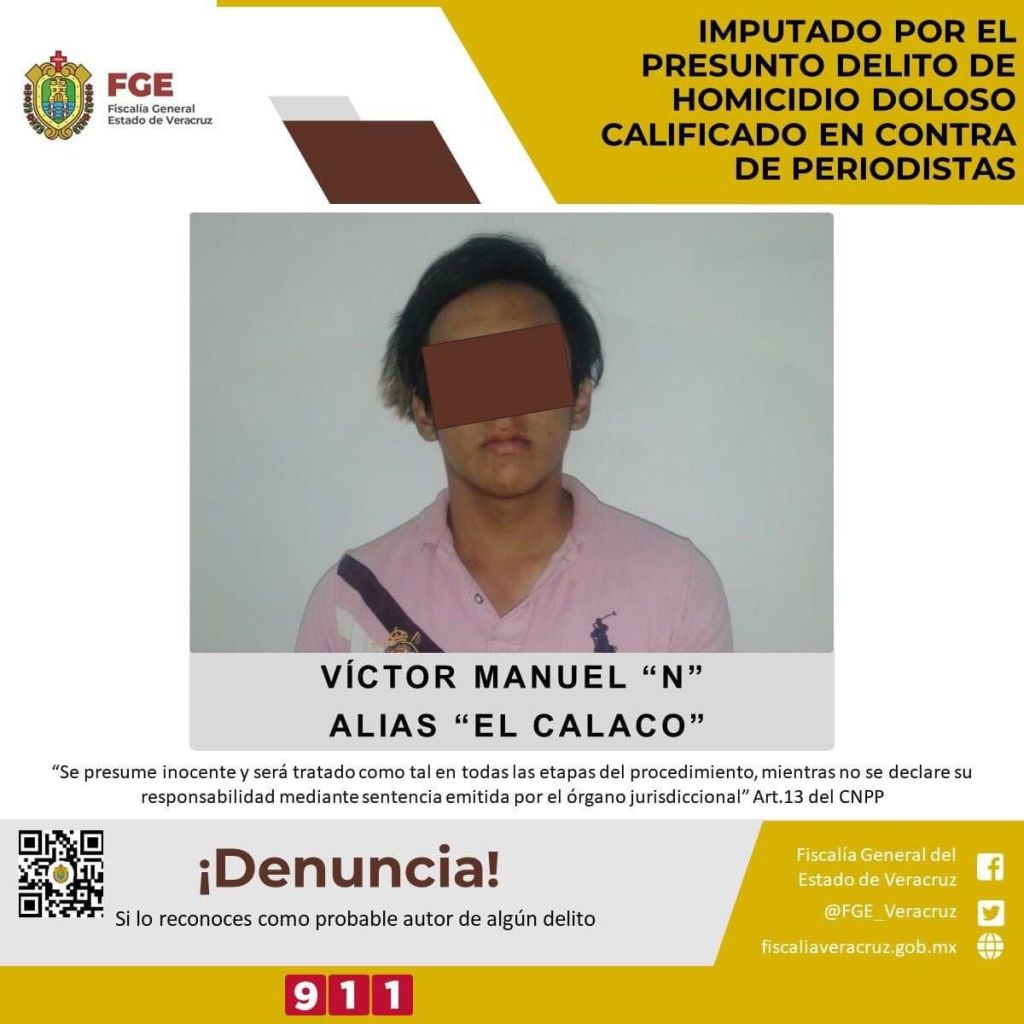 XALAPA, Ver., 8 junio 2022.- La Fiscalía General del Estado informa que a través de la Fiscalía Regional Coatzacoalcos, realizó imputación en contra de Víctor Manuel “N”, alias “El Calaco”, por el presunto delito de homicidio doloso calificado cometido en agravio de la directora del portal El Veraz, Yessenia Mollinedo Falconi y la reportera Sheila Johana García Olivera, hechos suscitados el pasado 9 de mayo del presente año en el municipio de Cosoleacaque.