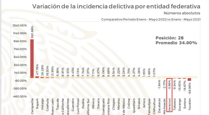 La variación de 3.96 por ciento en la incidencia delictiva ubica a Veracruz como una de las cinco entidades con mayor disminución en la cifra de delitos, junto con los estados de Tabasco, Durango, Sonora y Yucatán.