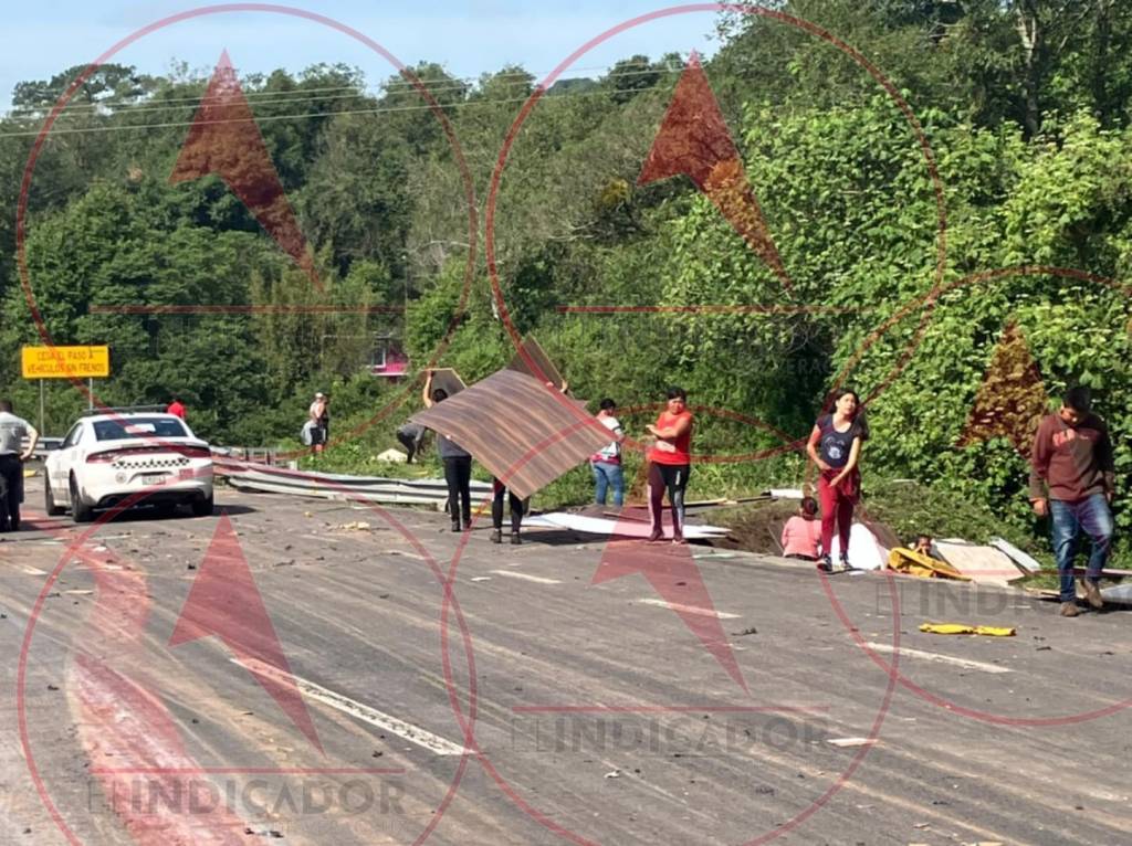 El vehículo que transportaba madera, circulaba con rumbo a la capital del estado, cuando el conductor perdió el control impactando a dos motociclistas y metros más adelante terminando volcado.