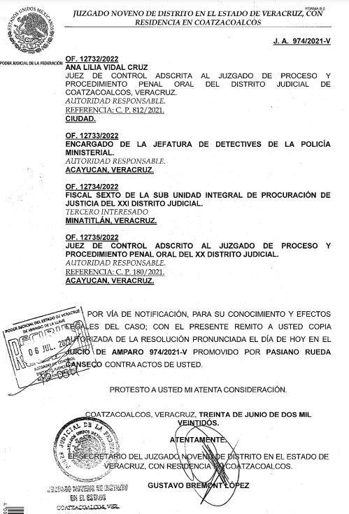 Y es que desde el día 30 de junio del 2022, se le dictó sentencia en el Juicio de Amparo Indirecto 974/2021 del índice del Juzgado Noveno de Distrito con residencia en Coatzacoalcos, el cual fue promovido por Pasiano Rueda Canseco, en donde se determinó que la Justicia de la Unión Ampara y Protege a PASIANO RUEDA CANSECO y que ordena dejar insubsistente la determinación de 1 de noviembre de 2021, por medio de la cual la Juez de Control adscrita al Juzgado de Proceso y Procedimiento Penal Oral del XXI Distrito Judicial calificó de legal la detención ordenando su inmediata libertad.