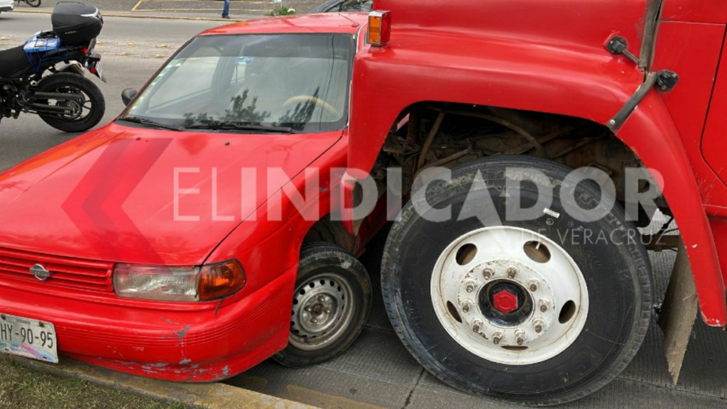 Un camión tipo volteo, impactó y arrastró a un automóvil particular, cuando transitaban por la avenida Lázaro Cárdenas, a la altura de la colonia Rafael Lucio, en esta ciudad.