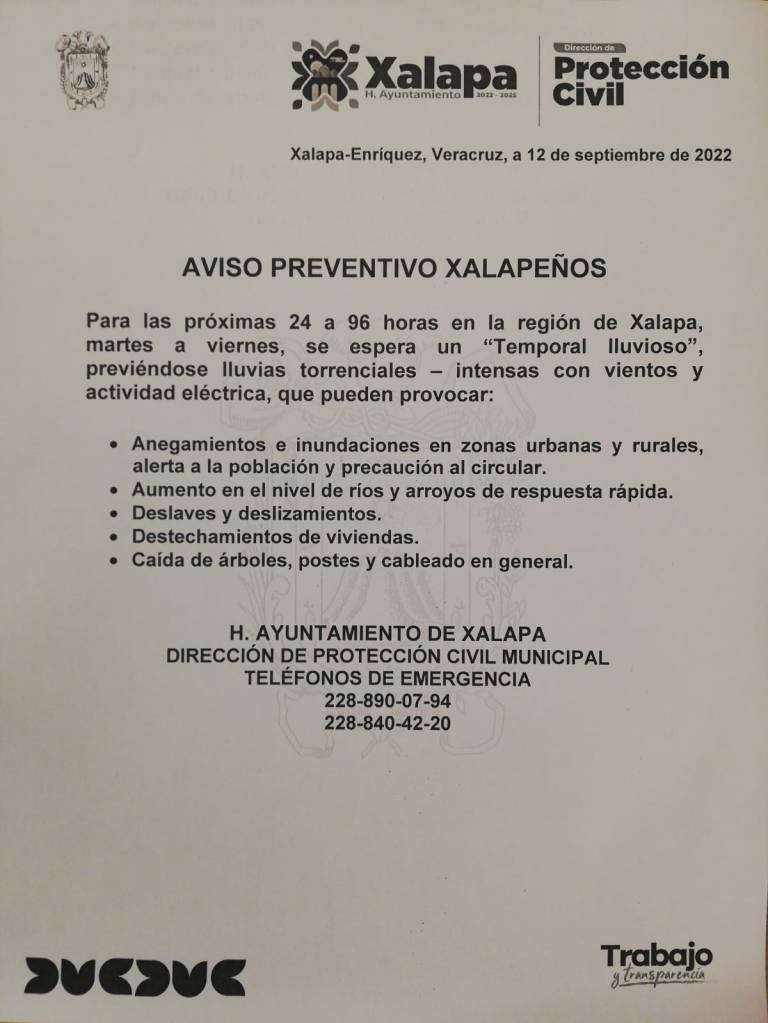 Xalapa, Ver.- La Dirección Municipal de Protección Civil emitió está noche un aviso preventivo para las próximas 24 a 96 horas por la presencia de un temporal lluvioso con lluvias torrenciales con vientos y actividad eléctrica.