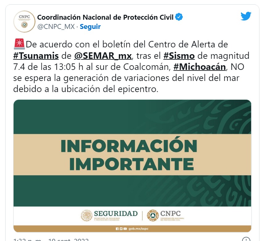 Informaron que no se espera la llegada de un tsunami. De acuerdo con la Coordinación Nacional de Protección Civil, la cual emitió un comunicado, no se esperan variaciones del nivel del mar.
