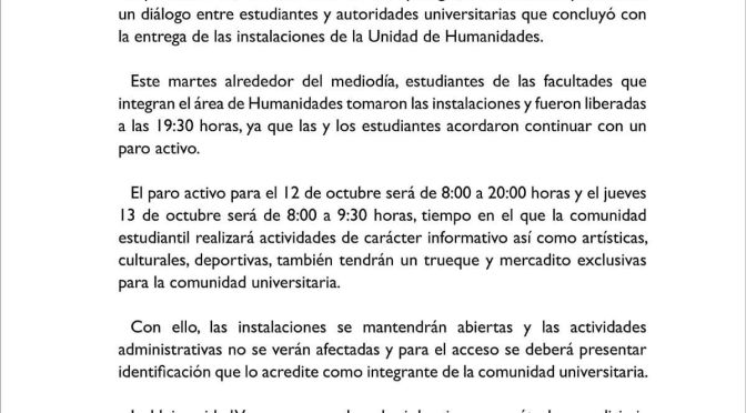 “El paro activo será el I2 de octubre será de 8:00 a 20:00 horas y el jueves 13 de octubre será de 8:00 a 9:30 horas, tiempo en el que la comunidad estudiantil realizará actividades de carácter informativo así como artísticas, culturales, deportivas, también tendrán un trueque y mercadito exclusivas para la comunidad universitaria”.