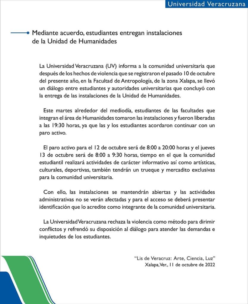 Estudiantes de la Unidad de Humanidades de la Universidad Veracruzana (UV), liberaron las instalaciones, pero dieron a conocer que mantendrán un “paro activo”.