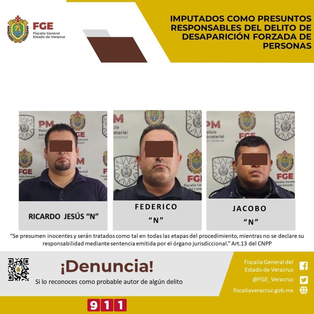 XALAPA, Ver., 14 de octubre del 2022.- La Fiscalía General del Estado que encabeza Verónica Hernández Giadáns, a través de la Fiscalía de Investigaciones Ministeriales, realizó imputación en contra de los policías estatales Ricardo Jesús “N”, Federico “N” y Jacobo “N” como presuntos responsables del delito de desaparición forzada de personas, hechos suscitados en la ciudad de Veracruz el pasado 29 de mayo del presente año en agravio de la víctima con iniciales J.A.C.M., quien en esos momentos laboraba como encargado de la Comandancia de la Policía Vial.