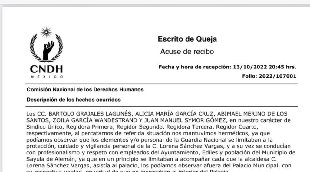Ediles de Sayula de Alemán presentaron escrito de queja en la Comisión Nacional de los Derechos Humanos (CNDH) por los atropellos de los que constantemente son víctimas por parte de elementos de la Guardia Nacional (GN) que custodian a la alcaldesa Lorena Sánchez Vargas.