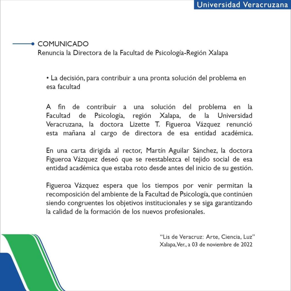 Lizette Teresa Figueroa Vázquez, renunció esta mañana del cargo de directora de la Facultad de Psicología de la Universidad Veracruzana (UV) en Xalapa.