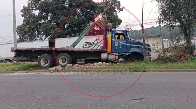 Un tráiler que transportaba block, chocó contra un poste y terminó arriba del camellón, la madrugada de este domingo.