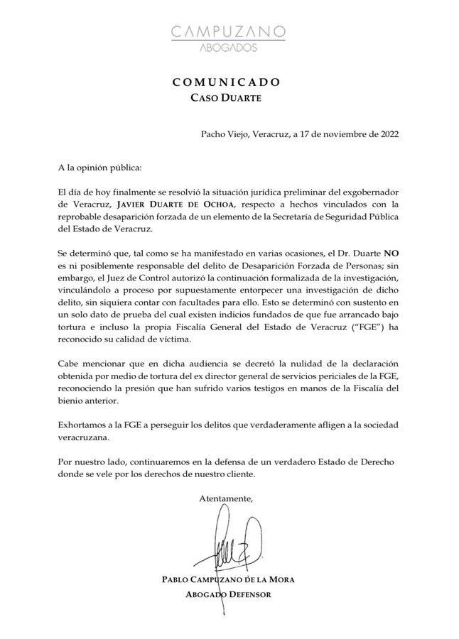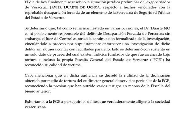 Pacho Viejo, Ver.- Mediante un comunicado, la defensa de Javier Duarte, ex gobernador de Veracruz, aseguró que después de que se resolviera la situación jurídica preliminar del ex funcionario y respecto a hechos vinculados con la reprobable desaparición forzada de un elemento de la Secretaría de Seguridad Pública del Estado de Veracruz, se determina que “el Dr. Duarte NO es ni posiblemente responsable del delito de Desaparición Forzada de Personas”.