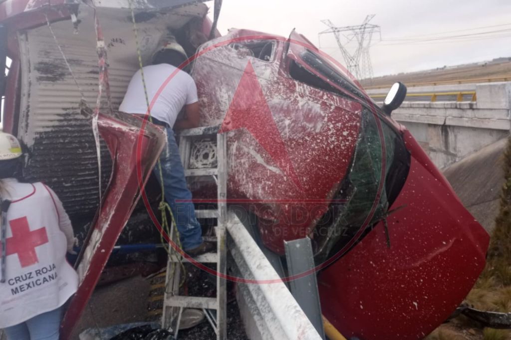 Bomberos y Cruz Roja Delegación Perote, acudieron a realizar la extracción de 4 personas que se encontraban prensadas con lesiones severas; 2 personas perdieron la vida dentro de la unidad.