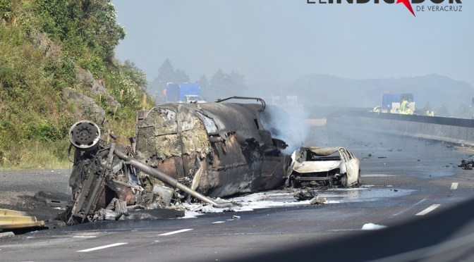 Una presunta falla mecánica en los frenos, habría ocasionado que una pipa que transportaba asfalto, se volcara cuando circulaba por la autopista Xalapa – Perote, a la altura de El Fresno.