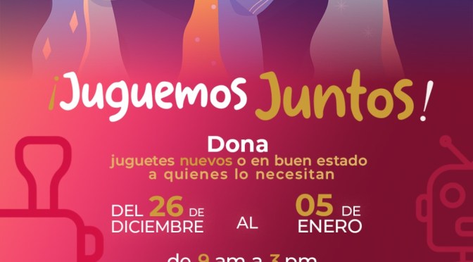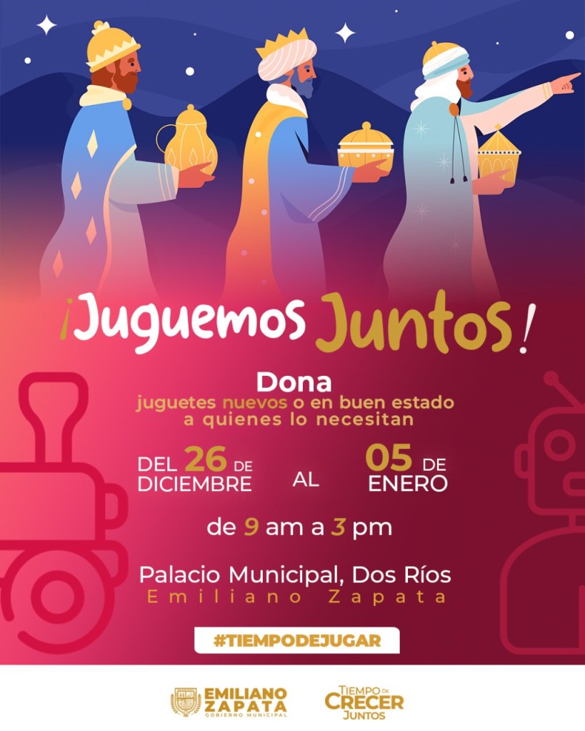 “Es tiempo de jugar para las niñas y niños que más lo necesitan. ¡Juguemos Juntos! Con tu apoyo llevaremos felicidad donando un juguete nuevo o en buen estado”, compartió en sus redes sociales, el presidente municipal Erick Ruíz Hernández.