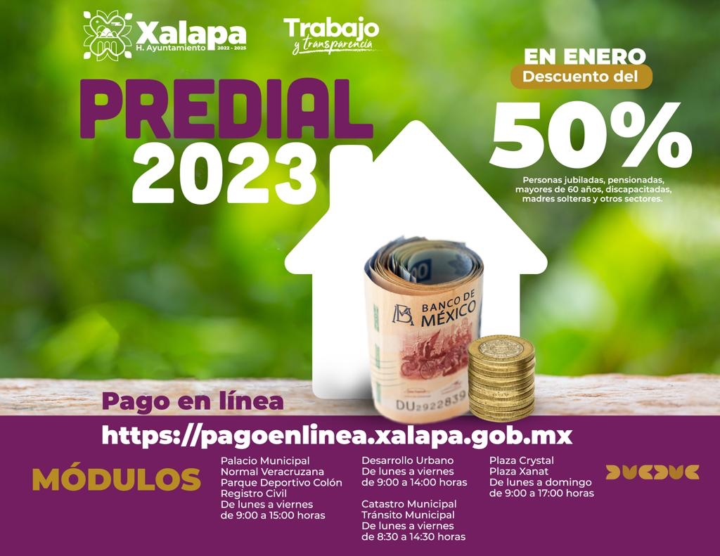 Xalapa, Ver.- A partir de este lunes 2 de enero, iniciará la Campaña masiva de pago del Predial 2023, mediante la cual adultos mayores y sectores vulnerables obtendrán un descuento de 50 por ciento en el pago de sus contribuciones durante enero, mientras que la población en general, 20 por ciento.