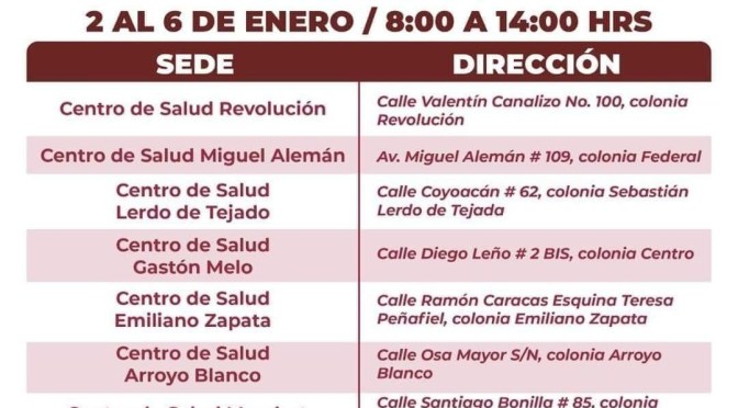 También el Centro de Salud “Emiliano Zapata”: el Centro de Salud “Arroyo Blanco”; y el Centro de Salud “Maraboto”.