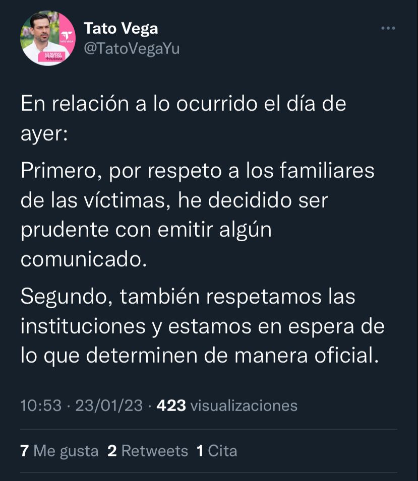 A través de sus redes sociales, precisó que por respeto a los familiares de las víctimas, «he decidido ser prudente con emitir algún comunicado.»