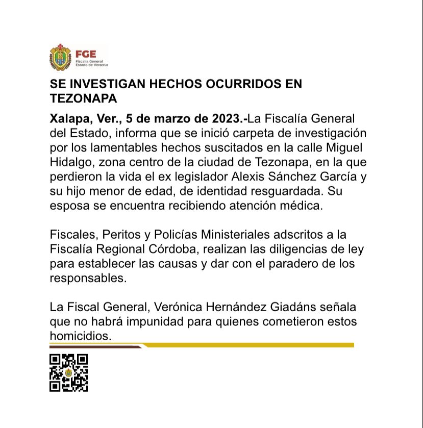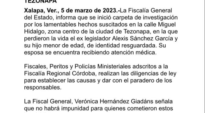 Xalapa, Ver., 5 de marzo de 2023.-La Fiscalía General del Estado, informa que se inició carpeta de investigación por los lamentables hechos suscitados en la calle Miguel Hidalgo, zona centro de la ciudad de Tezonapa, en la que perdieron la vida el ex legislador Alexis Sánchez García y su hijo menor de edad, de identidad resguardada.