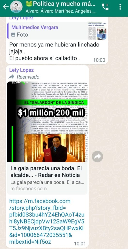 La mamá de la Regidora Séptima hace uso de los grupos de WhatsApp donde participa para compartir publicaciones en las cuales se ataca a la Síndica Única. Grupos en los cuales también está otro de sus empleados, Oscar Coria, y con ello deja en claro que le paga a Ramón Méndez para desacreditar a Vania López y todo proyecto del Ayuntamiento Municipal, pues desinforma a la población a través de Radar es Noticia y violenta a las autoridades municipales.