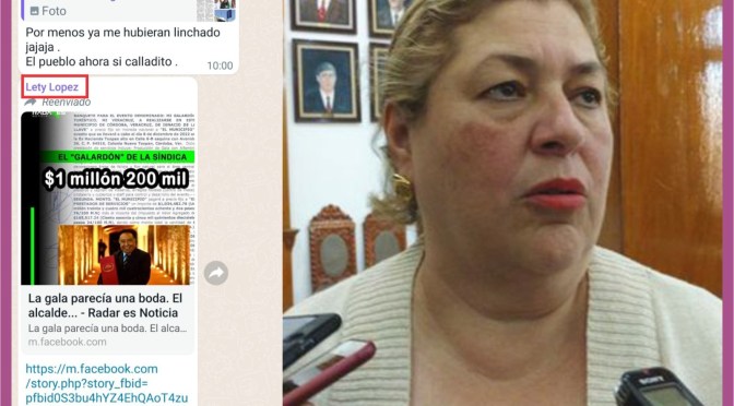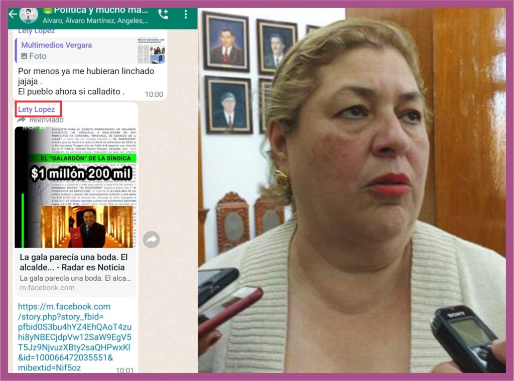 Córdoba,Ver.- En una prueba de que las mujeres también ejercen violencia de género contra otras mujeres, la exalcaldesa Leticia López Landeros, mamá de la regidora séptima Lety Luz, incita al odio y promueve la misógina de la página Radar es Noticia, de Ramón Méndez, contra la síndica única Vania López González.