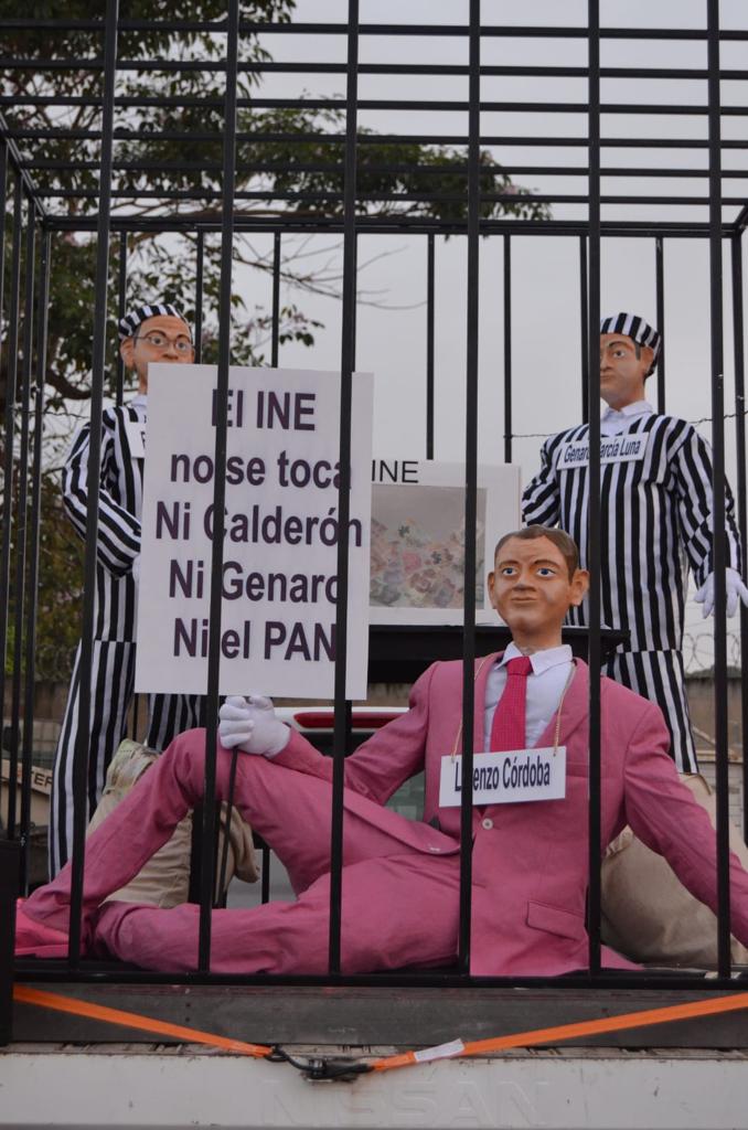 En esta manifestación pacífica, se pudieron observar un trio de botargas alusivas al ex secretario de Seguridad Pública, Genaro García Luna, al Consejero Presidente del INE, Lorenzo Córdoba y al ex presidente de México, el panista Felipe Calderón Hinojosa; a estos dos últimos, pidieron que sean investigados y encarcelados.