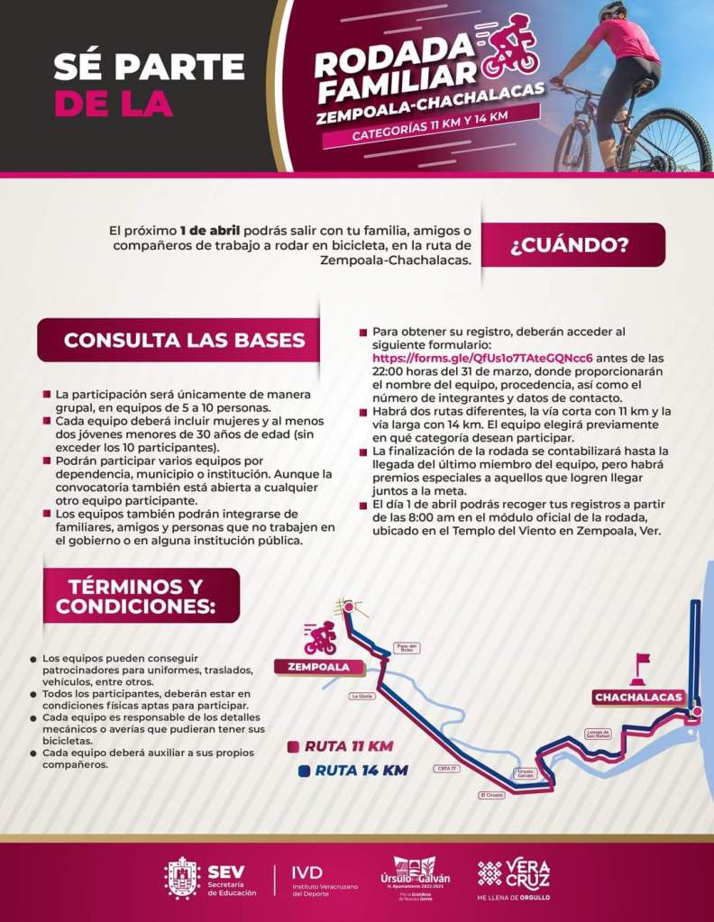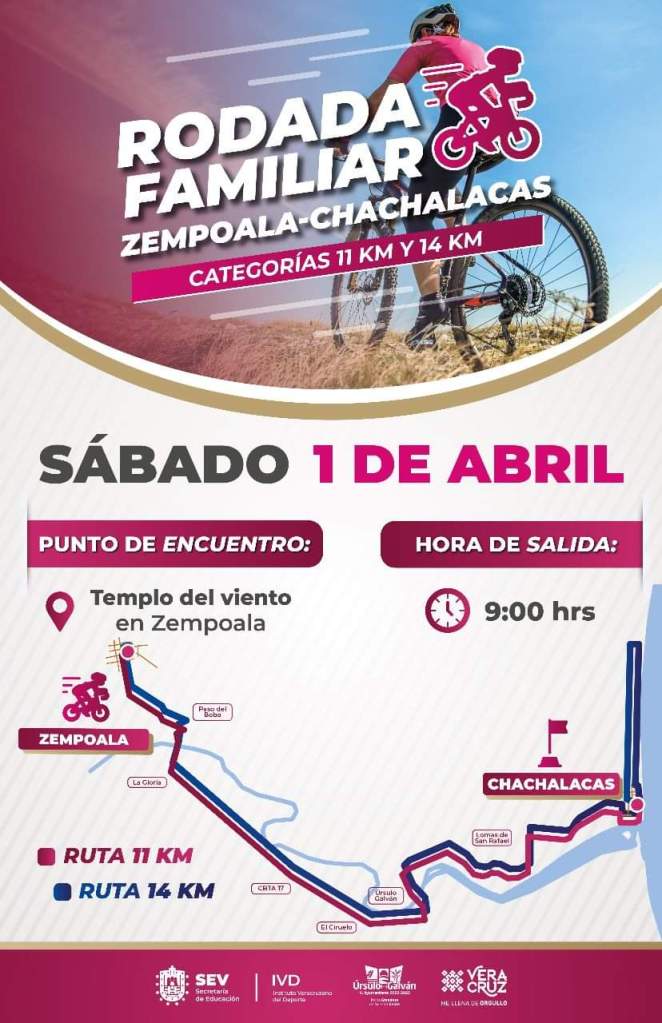Con el objetivo de seguir promoviendo el deporte y la convivencia familiar, gracias a la coordinación institucional del H. Ayuntamiento de Úrsulo Galván que encabeza el Lic. Eder Jero Hernández Lara con dependencias estatales, luego de reunirse con el Gobernador del Estado de Veracruz, Ing. Cuitláhuac García Jiménez, el presidente municipal anunció que el próximo sábado 1º de abril, se llevará a cabo la Rodada Familiar Zempoala-Chachalacas en sus categorías de 11 km y 14 km.