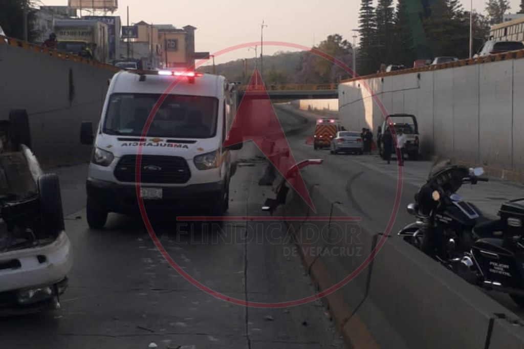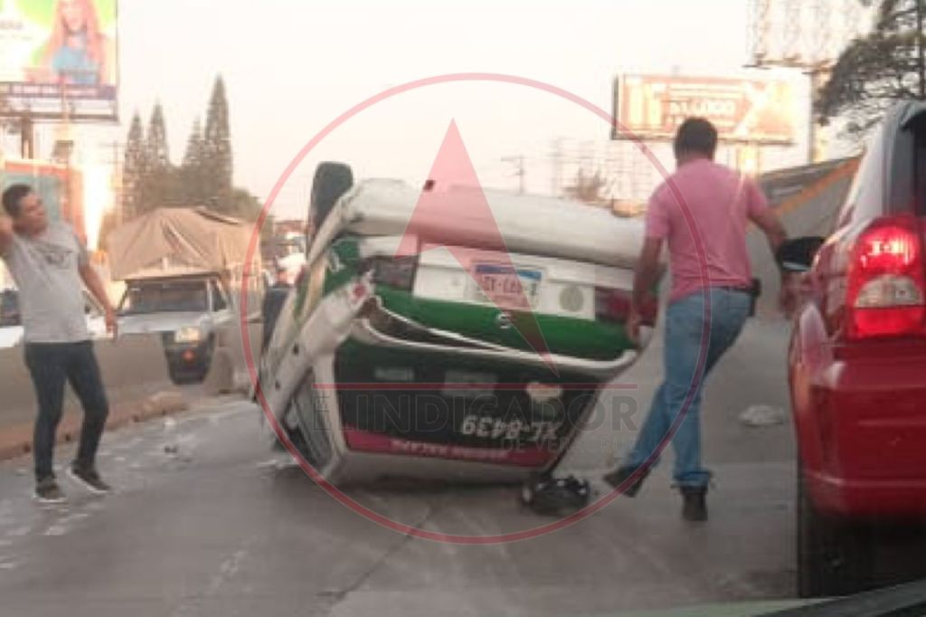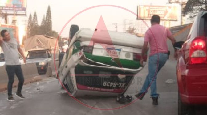 En el carril contrario transitaba el taxi el número económico XL-8439, el cual fue golpeado por uno de los bloques del muro divisor y terminó volcado.