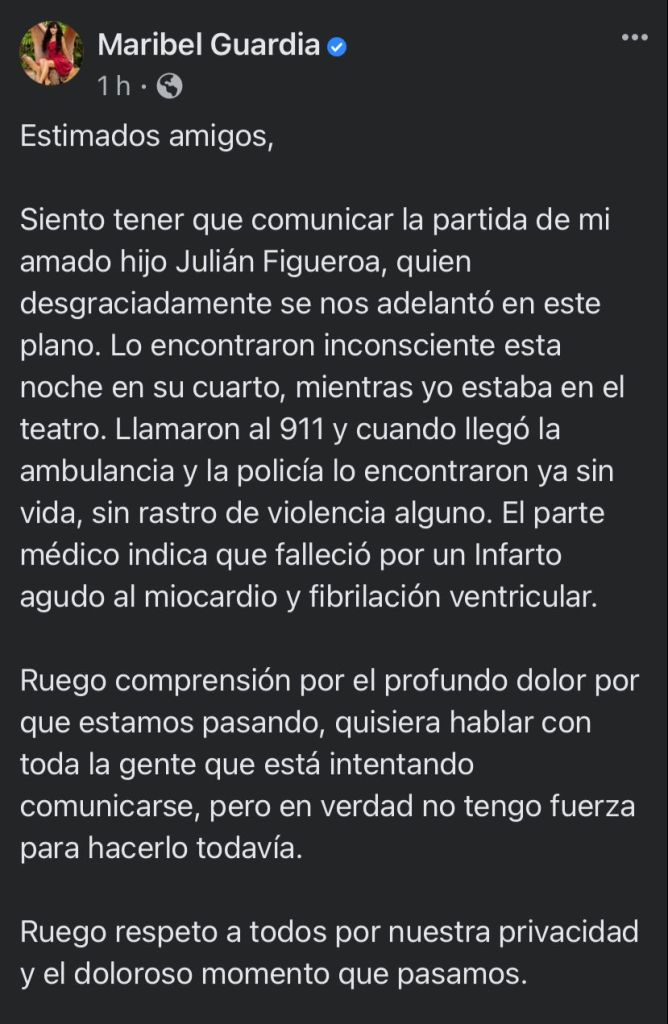 “Siento tener que comunicar la partida de mi amado hijo Julián Figueroa, quien desgraciadamente se nos adelantó en este plano. Lo encontraron inconsciente esta noche en su cuarto, mientras yo estaba en el teatro. Llamaron al 911 y cuando llegó la ambulancia y la policía lo encontraron ya sin vida, sin rastro de violencia alguno”.