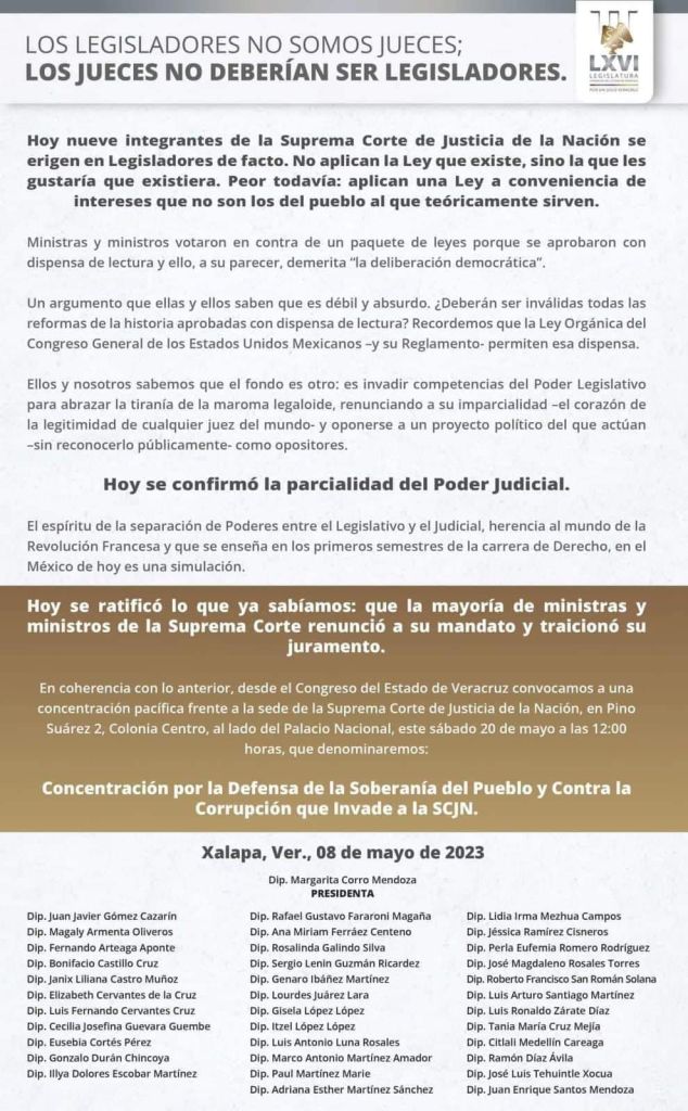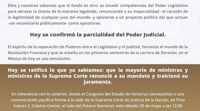 Desde el Congreso del Estado de Veracruz convocaron a una concentración pacífica frente a la sede de la Suprema Corte de Justicia de la Nación, en Pino Suárez 2, Colonia Centro, al lado del Palacio Nacional, el día sábado 20 de mayo a las 12:00 horas, que denominaron: