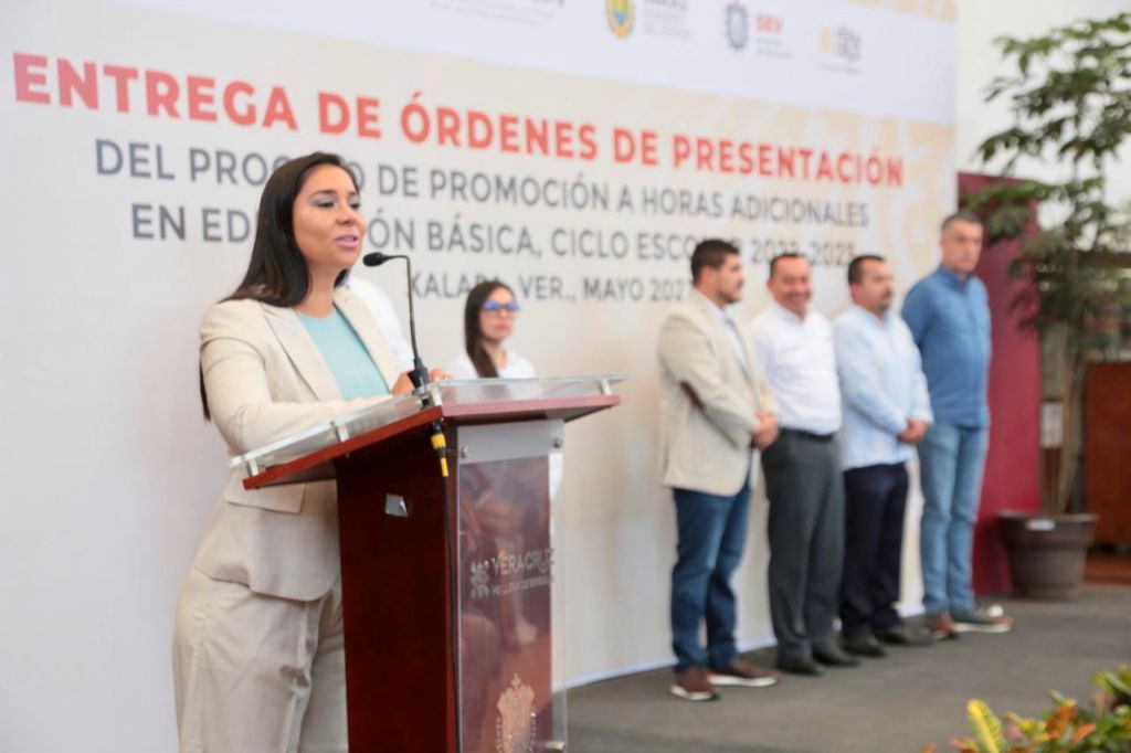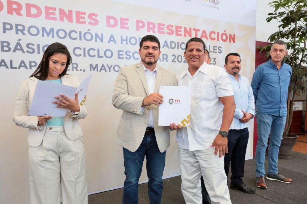 Xalapa, Ver., 9 de mayo de 2023.- En un acto de justicia social y como parte del orden administrativo que hace la Secretaría de Educación de Veracruz (SEV), su titular, Zenyazen Escobar García, entregó órdenes de presentación del proceso de promoción de alrededor de tres mil horas adicionales en Educación Básica, del ciclo escolar 2022-2023, de los niveles educativos de Secundarias Técnicas, Generales, y Educación Física.