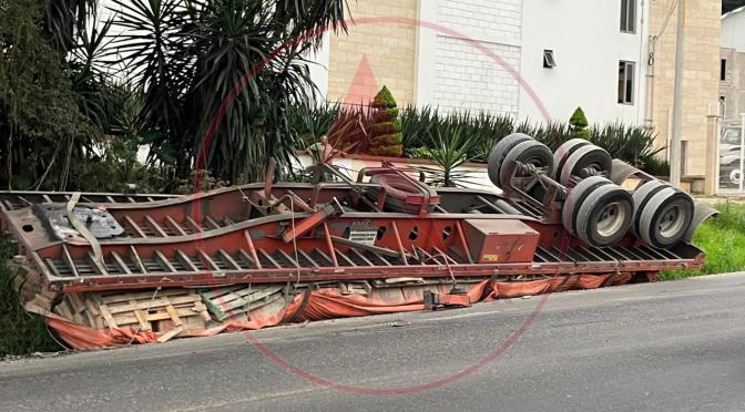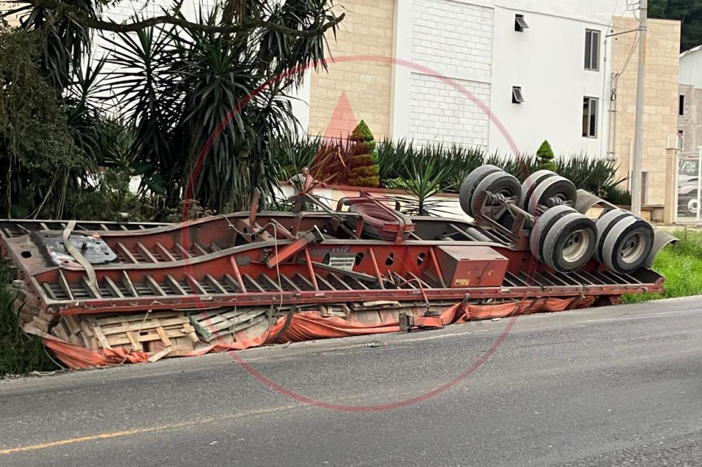 La plana de un tractocamión se volcó cuando circulaba por la carretera Xalapa – Perote, a la altura de la colonia 3 de Mayo del municipio de Banderilla.