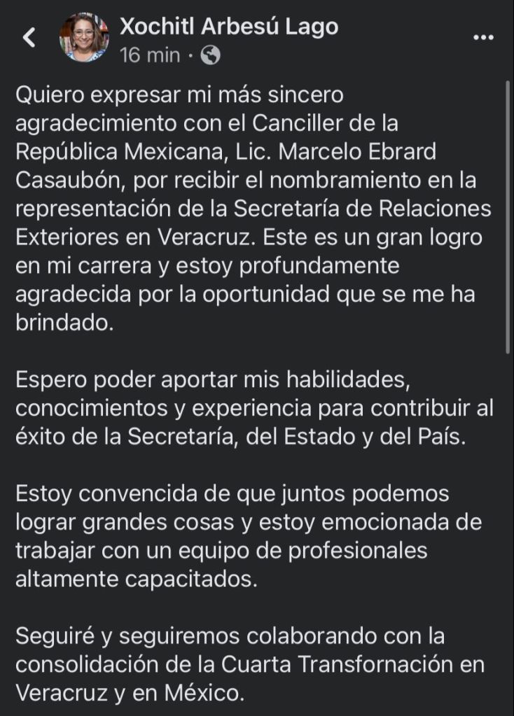 “Quiero expresar mi más sincero agradecimiento con el Canciller de la República Mexicana, Lic. Marcelo Ebrard Casaubón, por recibir el nombramiento en la representación de la Secretaría de Relaciones Exteriores en Veracruz. Este es un gran logro en mi carrera y estoy profundamente agradecida por la oportunidad que se me ha brindado”, publicó.