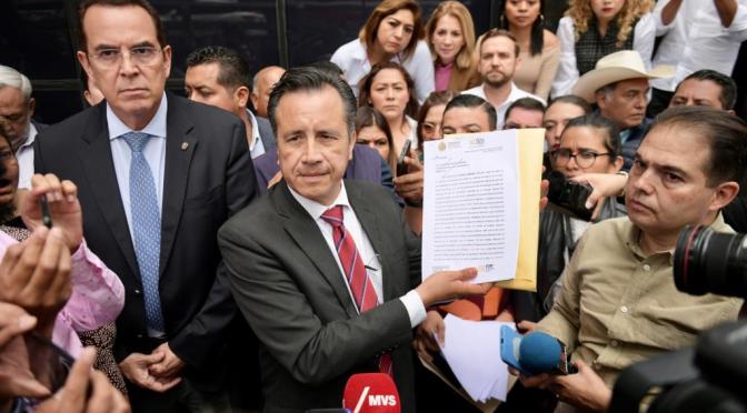Ciudad de México, 16 de mayo de 2023.- Ante la Fiscalía General de la República (FGR), el gobernador Cuitláhuac García Jiménez presentó la denuncia formal contra los jueces Cuarto y Quinto, José Arquímedes Gregorio Loranca Luna y Mario de la Medina Soto por encubrir actos ilegales en la construcción de la Torre Centro en la ciudad de Veracruz.
