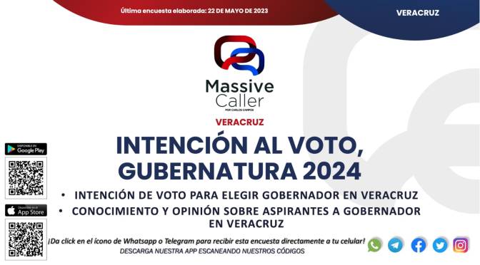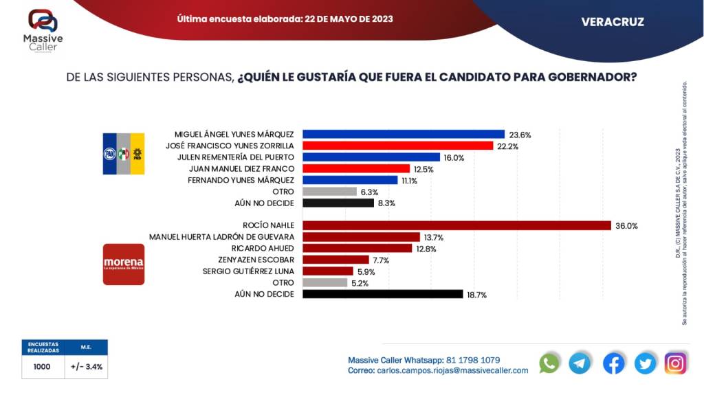 La secretaria de Energía, Rocío Nahle, y Morena encabezan las preferencias entre el electorado veracruzano para la próxima elección de 2024. Así lo muestra una encuesta realizada por la firma Massive Caller el 22 de mayo de 2023 sobre la intención del voto para la gubernatura.