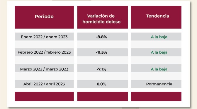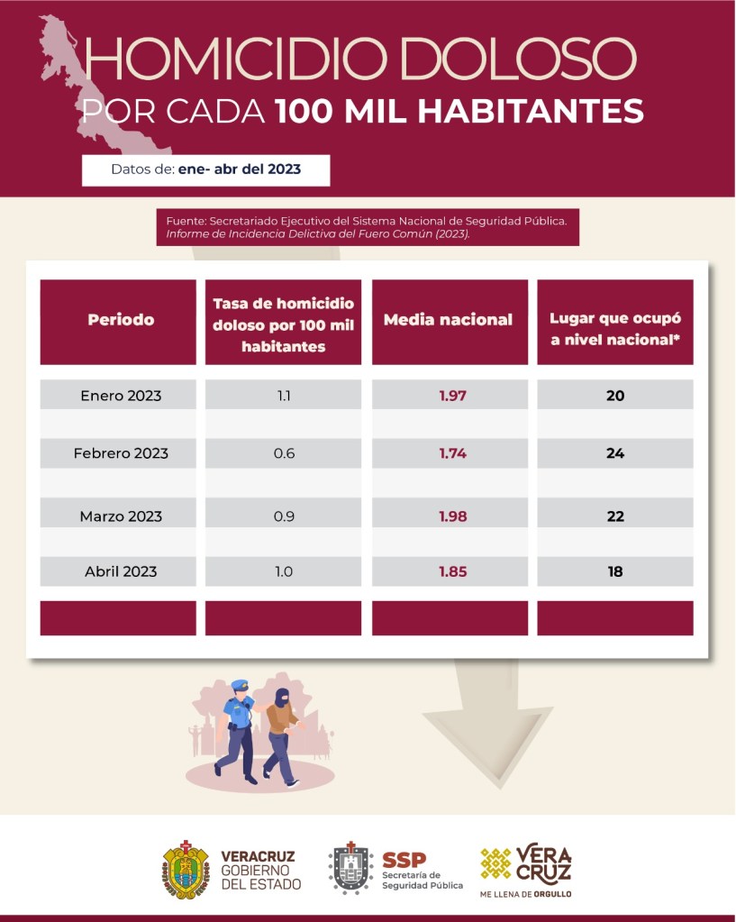 Según el Secretariado Ejecutivo del Sistema Nacional de Seguridad Pública(SESNSP), entre 2018 y 2023, el estado de Veracruz tuvo una disminución del 97.2 por ciento del delito de secuestro y del 54.8 por ciento en homicidio doloso.