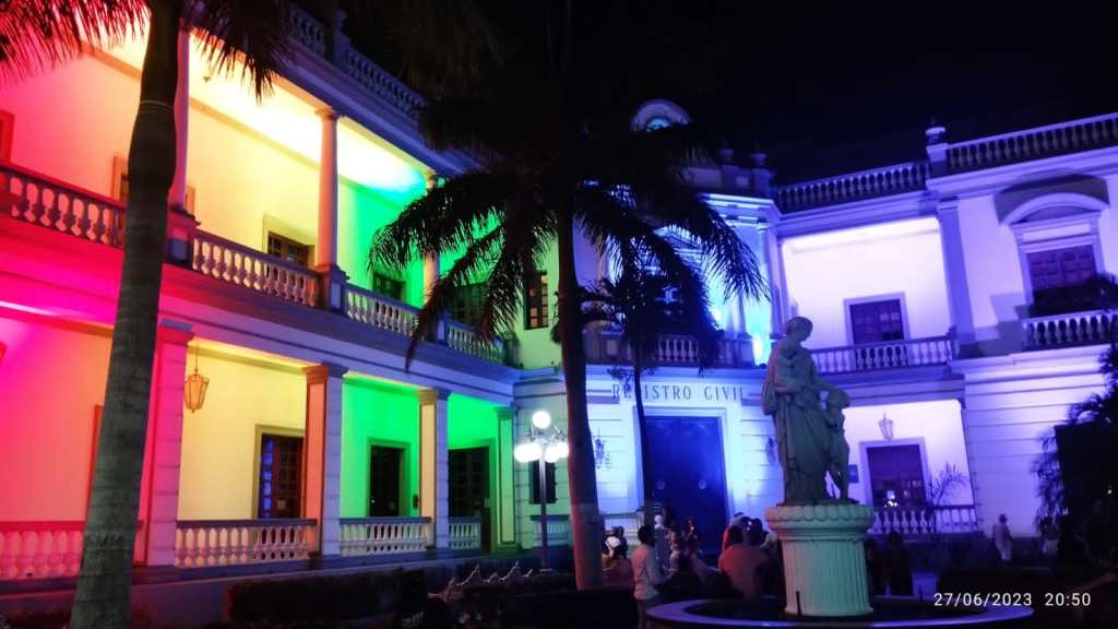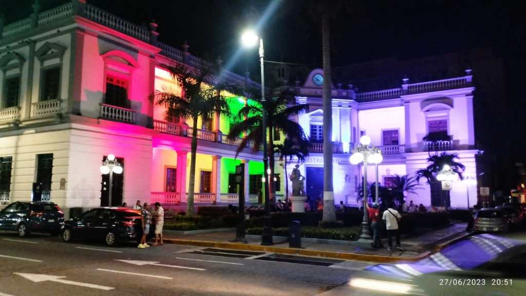 Veracruz Ver.- A las 19:30 horas de este martes se realizó el encendido de luces colores arcoíris, con motivo al 28 de junio conmemoración internacional LGBTIQ+ fue iluminado el registro civil del Puerto de Veracruz.