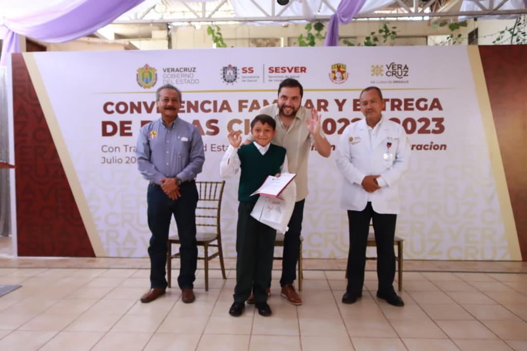 Álamo Temapache, Ver., 13 de julio de 2023.- Con un firme respaldo hacia el personal de salud y sus familias, Jorge Sisniega Fernández, Director Administrativo de Servicios de Salud de Veracruz, en conjunto con la Sección 26 zona norte del Sindicato Nacional de Trabajadores de la Secretaría de Salud (SNTSA), entregaron 57 becas de aprovechamiento escolar 2022-2023, gestionadas ante Salud del Gobierno Federal, para beneficio de las y los hijos de los trabajadores.