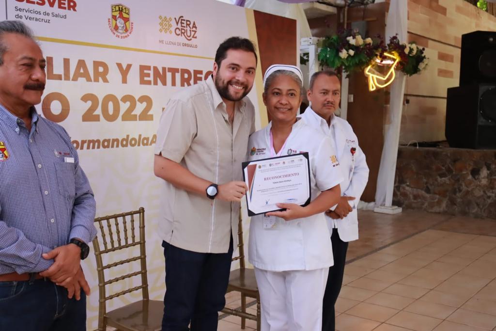 Durante el evento, el Director Administrativo de SESVER, junto con el Secretario General de la Sección 26 del SNTSA, Dr. Meynardo Maldonado Méndez, también hicieron entrega de reconocimientos a enfermeras y enfermeros, por su trayectoria, trabajo y dedicación en cada una de las unidades médicas de los Servicios de Salud de Veracruz.