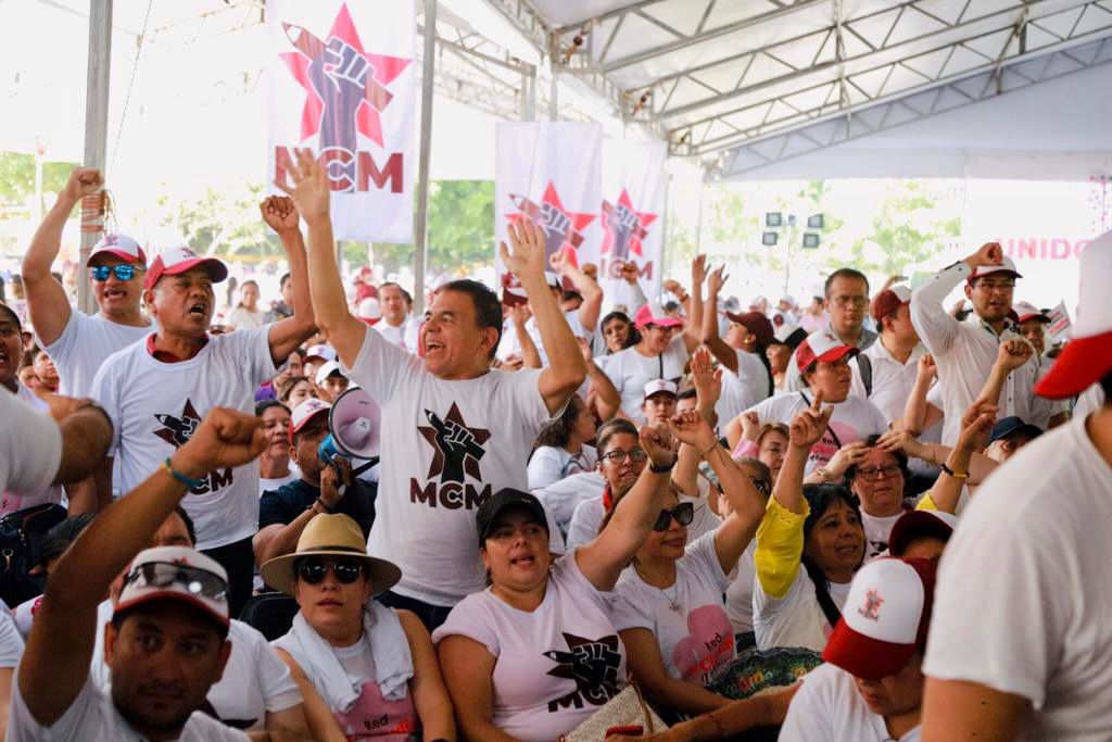Veracruz, Ver., 14 julio 2023.- Al grito de “¡Es un honor estar con la mejor!”, integrantes de Maestros Con Morena (MCM) ovacionaron a Claudia Sheinbaum, aspirante a la Coordinación Nacional por la Defensa de la Transformación, durante su visita al puerto.