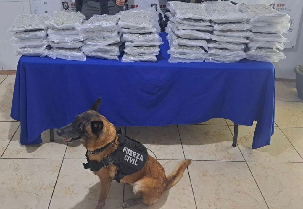 Los hechos ocurrieron cuando los oficiales realizaban acciones preventivas en un establecimiento ubicado en la colonia Nueva Mina, ahí los agentes caninos detectaron dos cajas de cartón que en su interior transportaban 54 bolsas de plástico selladas que a su vez contenían en su interior 32.100 kilogramos de hierba verde con características a la marihuana.