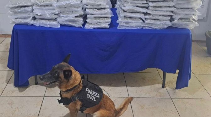 Los hechos ocurrieron cuando los oficiales realizaban acciones preventivas en un establecimiento ubicado en la colonia Nueva Mina, ahí los agentes caninos detectaron dos cajas de cartón que en su interior transportaban 54 bolsas de plástico selladas que a su vez contenían en su interior 32.100 kilogramos de hierba verde con características a la marihuana.