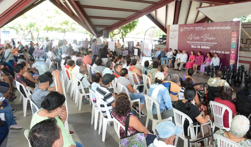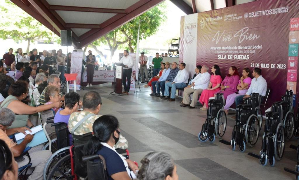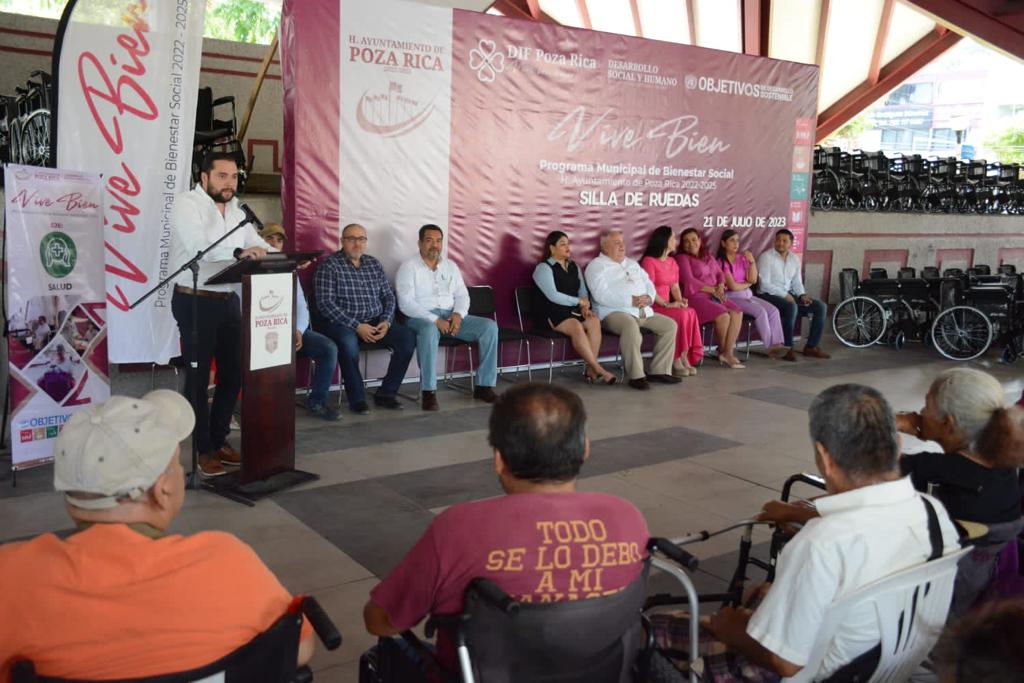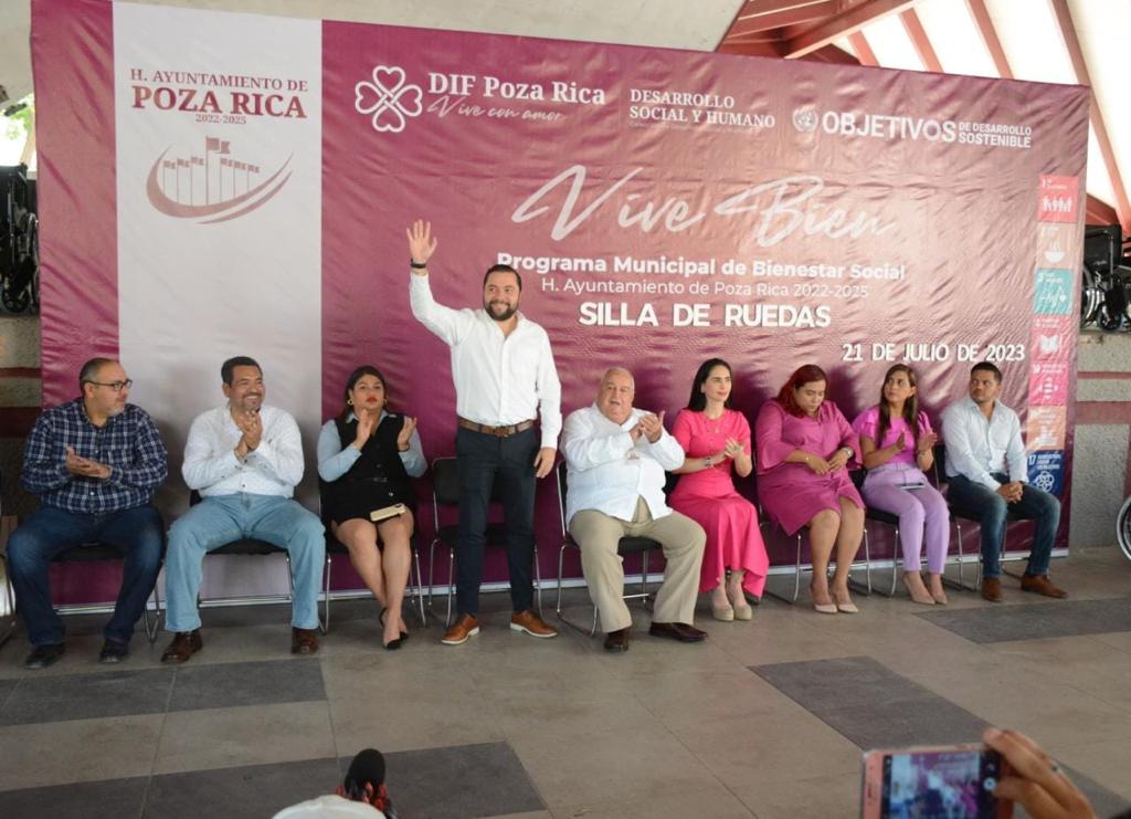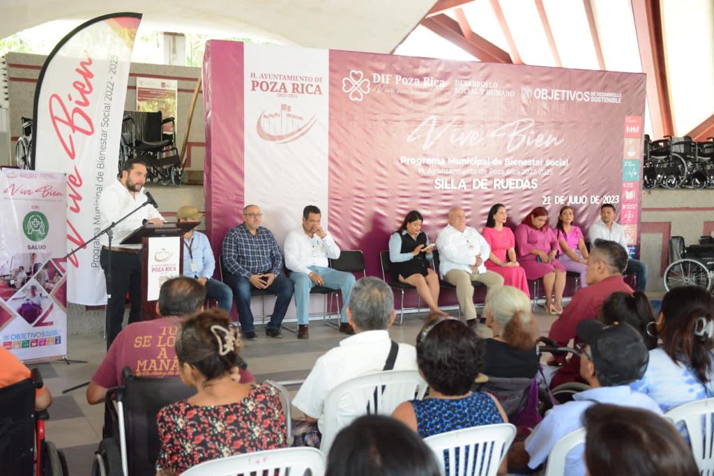 Poza Rica, Ver., 21 de julio de 2023.- “Me es grato estar en Poza Rica, siempre me dará gusto porque es la tierra que me vio nacer”, dijo el Director Administrativo de Servicios de Salud de Veracruz, Jorge Sisniega, al acompañar este viernes al alcalde Fernando Remes Garza, la presidenta del DIF, Diana Patricia Remes Oropeza y Cabildo del H. Ayuntamiento, en la entrega de 200 sillas de ruedas del programa municipal de Bienestar Social “Vive Bien”.