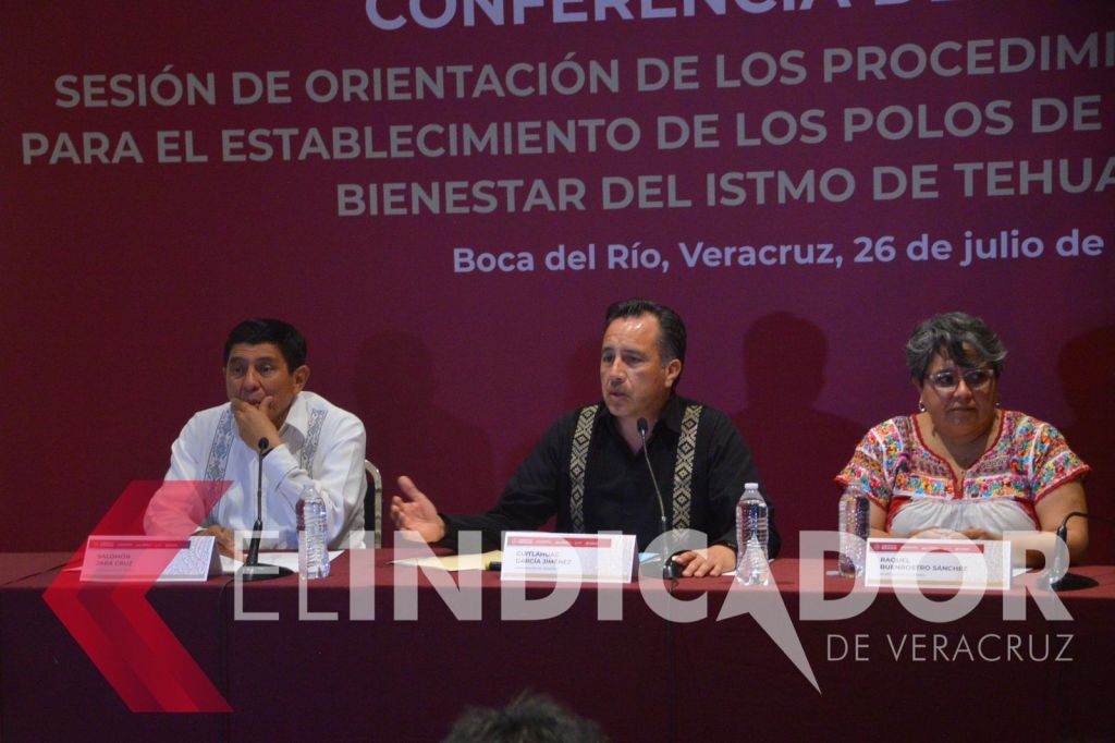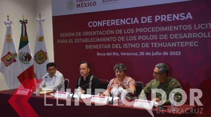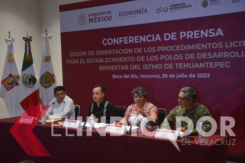 Boca del Río, Ver.- En las instalaciones del WTC, el gobernador Cuitláhuac García Jiménez acompañado por la titular de la Secretaría de Economía, Raquel Buenrostro Sánchez, el gobernador de Oaxaca, Salomón Jara Cruz y el Vicealmirante Raymundo Pedro Morales, dieron a conocer los procedimientos licitatorios para el establecimiento de los Polos de Desarrollo para el Bienestar del Istmo de Tehuantepec, que tiene como objetivo la concesión por dos años para el uso, aprovechamiento y explotación, con posibilidad de enajenación, de los polos ubicados dentro del Corredor Interoceánico del Istmo de Tehuantepec, a los que le serán aplicables beneficios fiscales y administrativos.