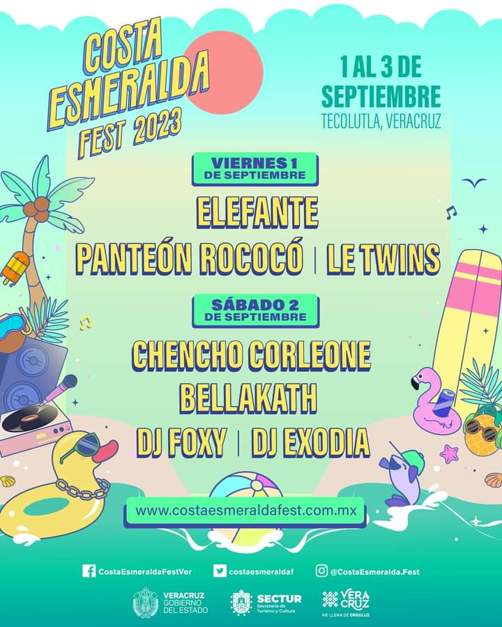 Xalapa, Ver.- Chencho Corleone, Panteón Rococó, Bellakath y Elefante, forman parte del gran elenco que se presentará del 1 al 3 de septiembre en el «Costa Esmeralda Fest 2023», que contarán con más de 53 mil asistentes.