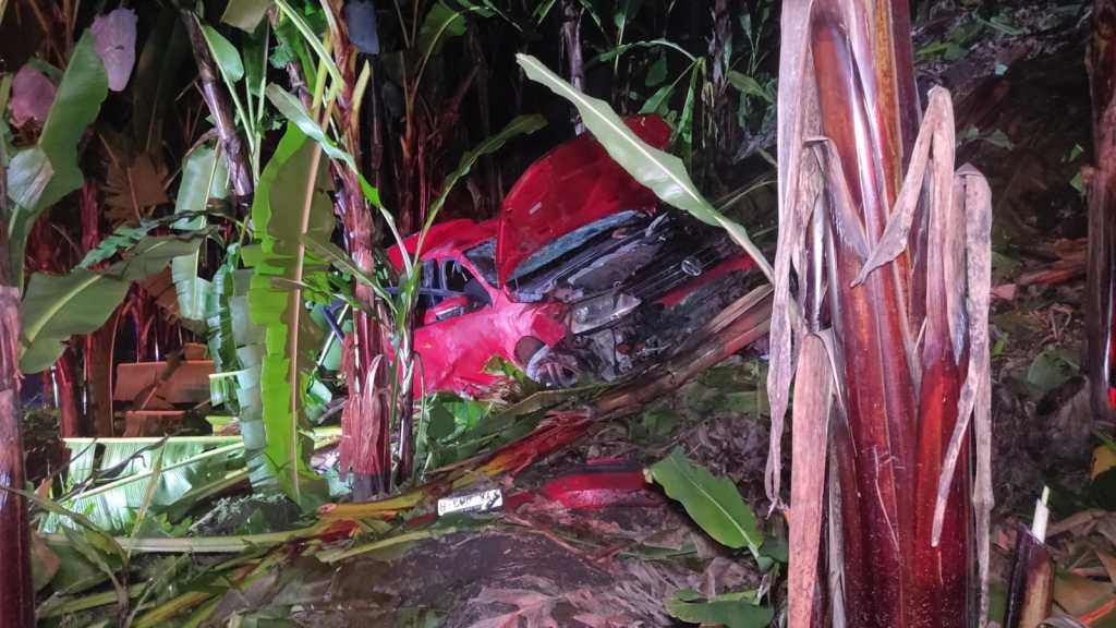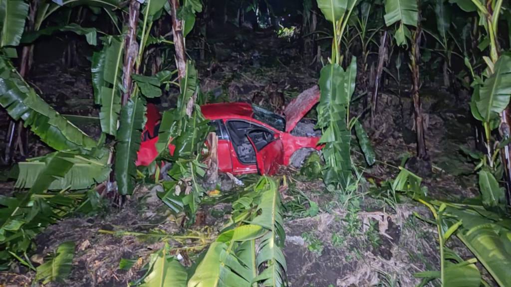 Estos hechos se registraron cerca de las 3 de la mañana cuando al agarrar una curva, perdió el control y se salió, terminando en un barranco lleno de matas de plátano, lo que amortiguó la caida del vehículo y terminó por salvarle la vida.